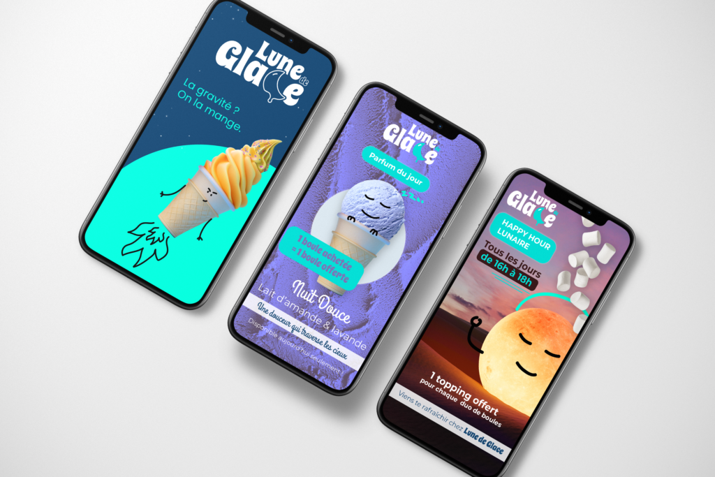 L’univers joue sur la tension entre l’immensité de l’espace et le plaisir immédiat d’une glace. Chaque parfum devient un personnage — un nom poétique, une personnalité, une accroche qui lui appartient.